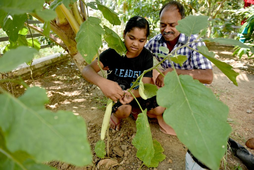 Sudheesh Kumar and his daughter pluck vegetables in their small kitchen garden in Yeroor, India, February 17, 2021. Kumar worked at the Jeddah airport and returned last year to his village, and now seeks work at farms and the local stone quarry to repay loans he took to build a two-storey house for his family. Photo: Thomson Reuters Foundation/Rakesh Nair