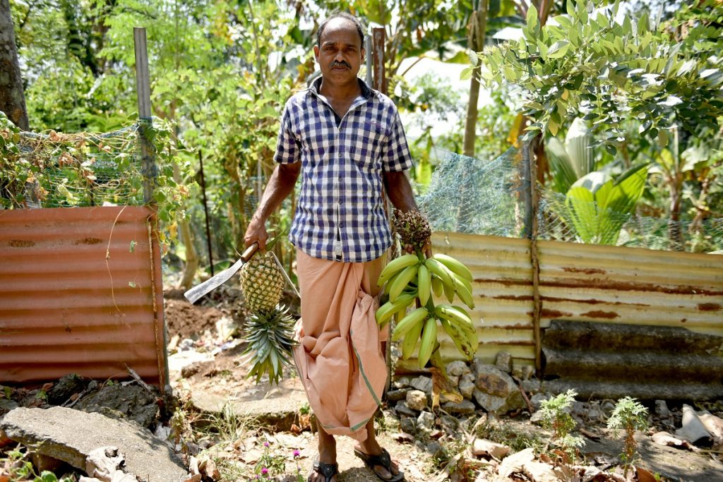 Sudheesh Kumar poses with bananas he plucked from his farm in Yeroor, India, February 17, 2021. Kumar worked at the Jeddah airport and returned last year to his village, and now seeks work at farms and the local stone quarry to repay loans he took to build a two-storey house for his family. Photo: Thomson Reuters Foundation/Rakesh Nair