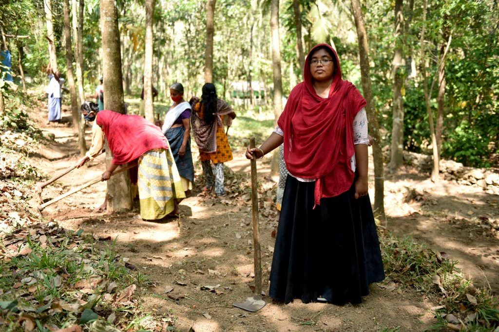 Shamna Khan poses for a picture at a rubber plantation where she is employed under the rural scheme in Yeroor village, India, February 17, 2021. Khan took up work for the first time despite her swollen right leg due to lymphoedema after her husband returned jobless from Qatar during the pandemic. Photo: Thomson Reuters Foundation/Rakesh Nair