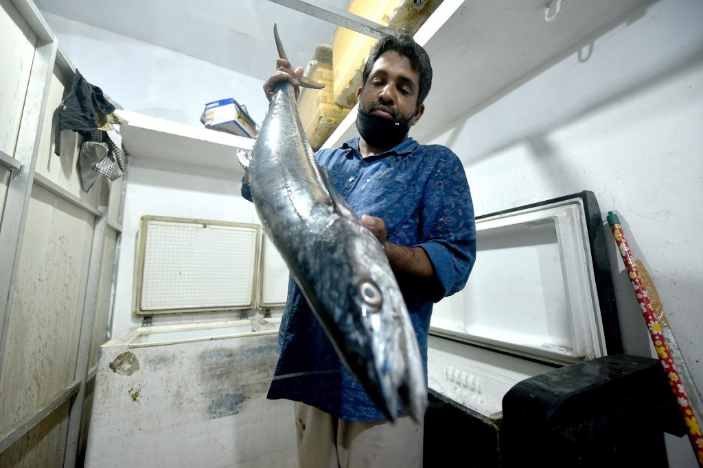 Ajimon Mak loads fresh fish into the freezer at his fish stall in Thiruvananthapuram, India, February 22, 2021. Mak overcame family resistance to start the fish business after his travel company shuttered during the lockdown last year. Photo: Thomson Reuters Foundation/Rakesh Nair