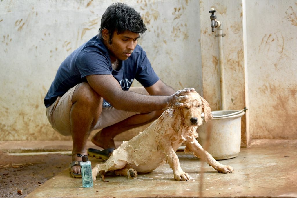 Binoj Kuttappan bathes a puppy at the dog breeding facility he has created in the backyard of his house in Thiruvananthapuram, India, February 18, 2021. Photo: Thomson Reuters Foundation/Rakesh Nair