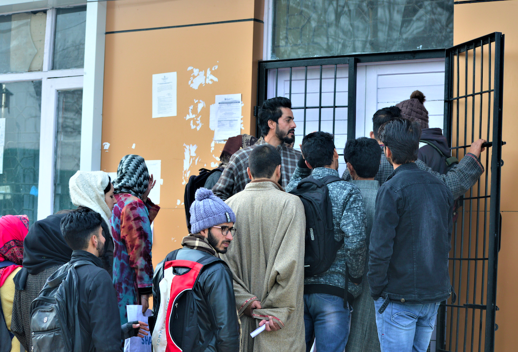 People queue up to go online at a government set-up internet cafe in Budgam, Indian-administered Kashmir on December 24, 2019. Photo: Thomson Reuters Foundation/Athar Parvaiz