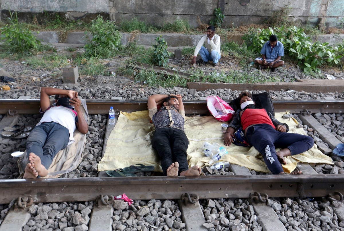Migrant workers rest on a railway track during a 21-day nationwide lockdown to slow the spreading of coronavirus disease (COVID-19) in in Mumbai, India, April 2, 2020. Photo: Reuters/Prashant Waydande