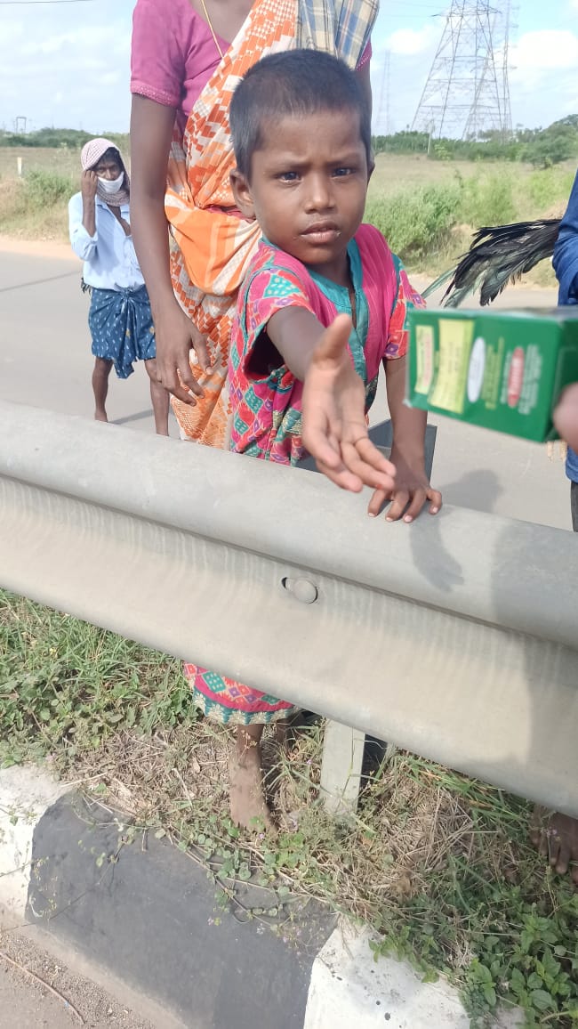A child from a migrant family walking towards Howrah receives relief material from volunteers at NH 16 in Chennai on May 14. Photo: Ariwarasan