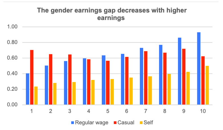The largest earnings gap is based on gender, with women reporting earnings at only 40% of those of men in self-employment, followed by 64% of men in casual wage jobs, and 76% of men in regular wage jobs.