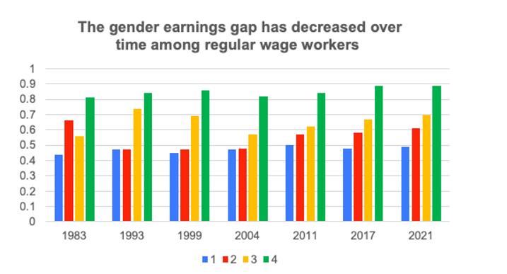 There are a number of possible explanations for the narrowing of the gender earnings gap, such as increased awareness of gender discrimination, anti-discrimination laws, and changes in social norms.