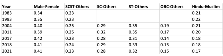 The segregation index between men and women in 1983 was 0.34 which increased to reach a value of 0.41 in 2021. Caste-based industrial segregation between SC/ST and others, including OBCs, remained almost the same, declining slightly between 2004 and 2021. Industrial segregation between Hindus and Muslim was even lower at around 0.17 to 0.21. This means that 40% of the workforce would need to be redistributed along gender lines across industries to achieve gender parity.