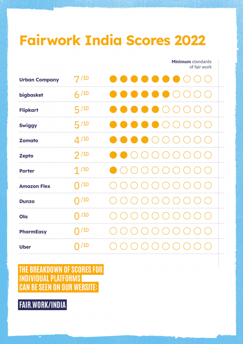 According to the Fairwork India Ratings 2022 report, aside from Bigbasket, Flipkart, and Urban Company, no other platform publicly commits to paying or provides sufficient evidence of paying their workers the hourly local minimum wage after work-related costs are subtracted.