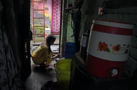 A woman resident of the Wazirpur slum washing utensils before setting off to work. Photo: Jignesh Mistry.