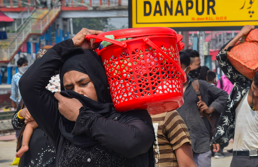 A woman migrant worker returns to Bihar's Danapur station. Photo: PTI