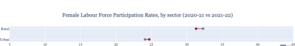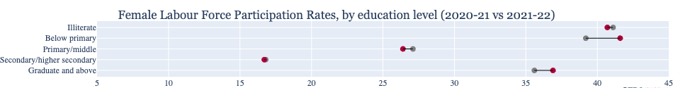After increasing for another year, in 2021-22, the improving trend seems to have been arrested (Figure 1). However, the changes haven’t been homogenous for all women – in 2021-22, the LFPR saw small dips for rural women, women from Scheduled Tribe, Scheduled Caste, and Other Backward Class communities, as well as women who were illiterate or had primary-to-middle level of education. On the other hand, the LFPR among urban women, women with graduate (or higher) level education, or who were illiterate saw a marginal improvement between 2020-21 and 2021-22. (Figure 2)