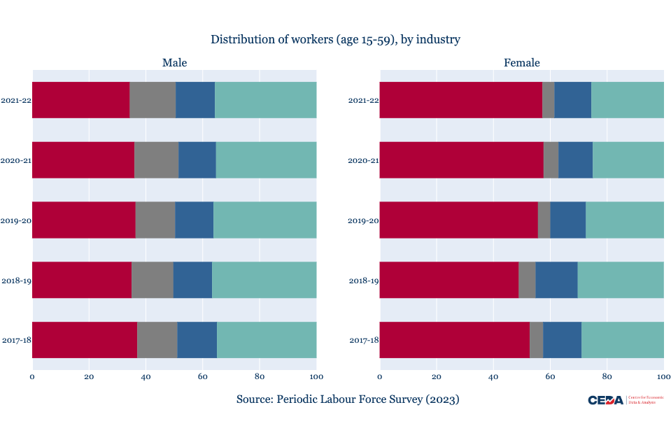 “Self-employed” includes those who are own-account workers, employers or unpaid helpers. Among women who were self-employed in 2021-22, more than half (53%) worked as “unpaid helpers” and 44.5% were working as “own account workers” (those who operate their own enterprises without hiring any labour). Only 1% among those self-employed employed others in their enterprise. In comparison, of the men (aged 15-59) who were self-employed in 2021-22, 74.3% were own account workers, 5.9% were employers, and only 17.9% worked as unpaid helpers (Figure 4).