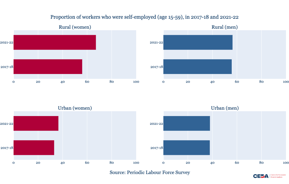 In 2017-18, 48% of women (aged 15-59) were self-employed, a proportion similar to that of men (48.9%), but this proportion has grown over the last four years. A similar growth has not occurred among male workers. And among women, this increase in self-employment has been driven largely by rural areas (Figure 5).