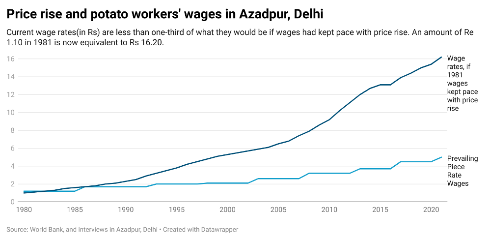 With the APMC not having revised official pay rates for many years, the workers, primarily landless Dalit migrants from Bihar, have managed to negotiate piece rate hikes of only 50 paise to Re 1 a year. In potatoes, in absence of any official revision by the government, they managed to negotiate their rate of payments from Re 1.2 to only Rs 5 per sack in 40 years, even if cost of living has gone up manifold.