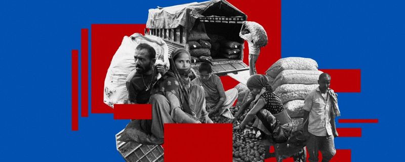 The workers said they felt pressured to guard the gunny bags overnight even as they had no fixed pay, as their piece rate payments varied based on how many trucks arrived, going to zero if no new produce had arrived that day. “If a single gunny bag goes missing, or even if stray cattle eat part of the produce, it will be deducted from our piece-rate pay,” said a worker, Mohammad Gulzar.