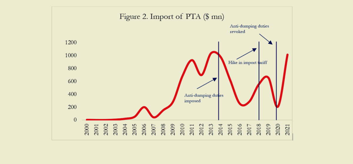 The answer to the questions lies in two policy interventions that the government introduced. First, the government imposed anti-dumping duties in 2013 on PTA imports from major source countries, making the import prices prohibitive. Second, in 2018, the government hiked the import tariff on PTA from 7.5% to 10% which further increased import costs.