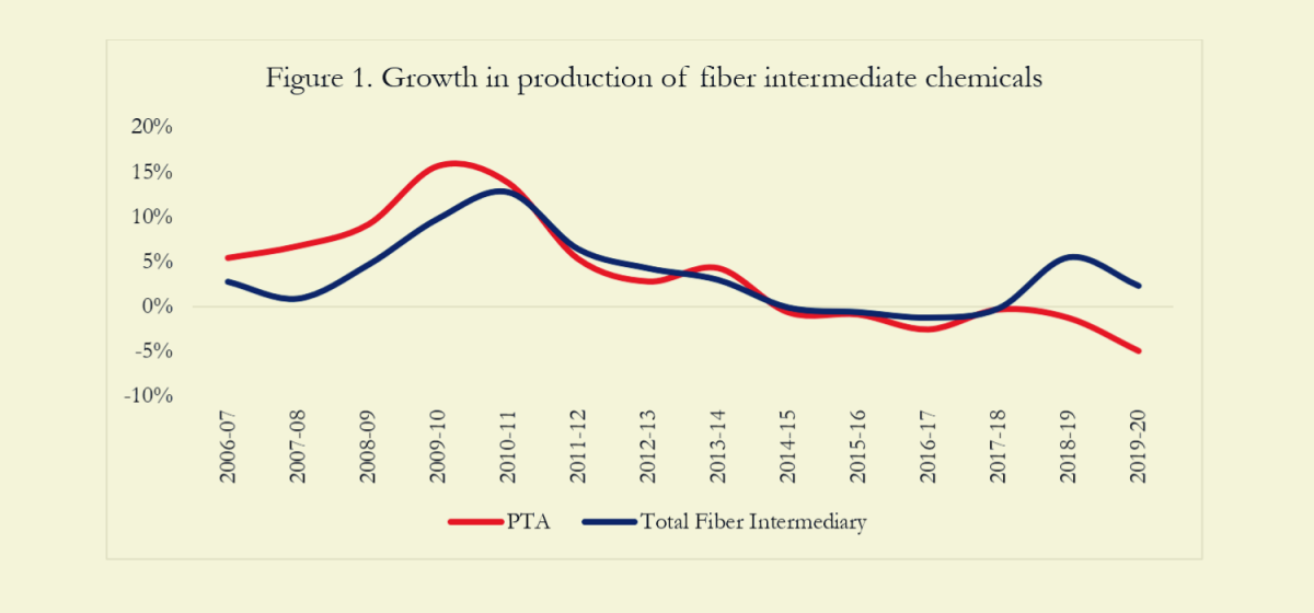 In our new research, we find that the key reason for the setback India has faced is the declining production of polyester fibre. The decline stems from the stalled progress in the domestic production of key chemical intermediaries, Purified Terephthalic Acid (PTA), required for the production of polyester yarn and fiber. Growth in domestic production of PTA declined sharply since 2010 and has witnessed virtually no growth since 2014 (see Figure 1).