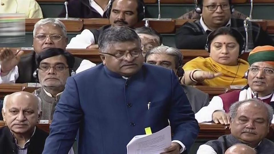 Union law minister Ravi Shankar Prasad speaks in the Lok Sabha in New Delhi on Thursday, during the winter session of Parliament. Credit: PTI