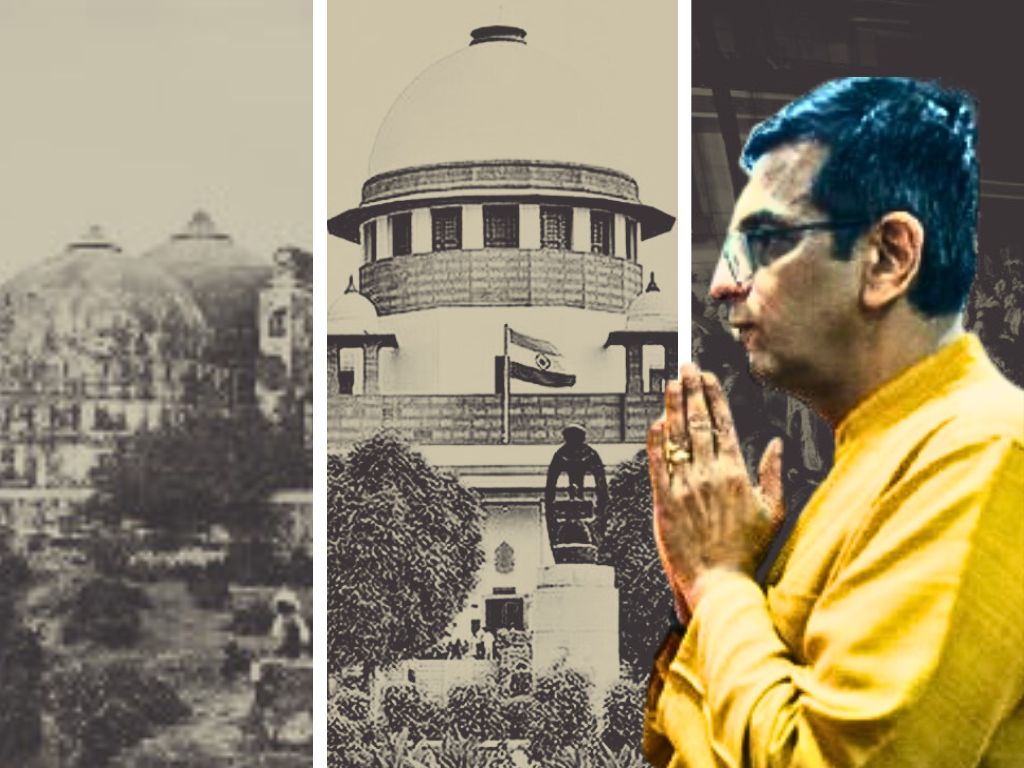 CJI Chandrachud from an image uploaded by PM Modi. In the background is a triptych of the Babri Masjid, the Supreme Court and a representative crowd of protesters.