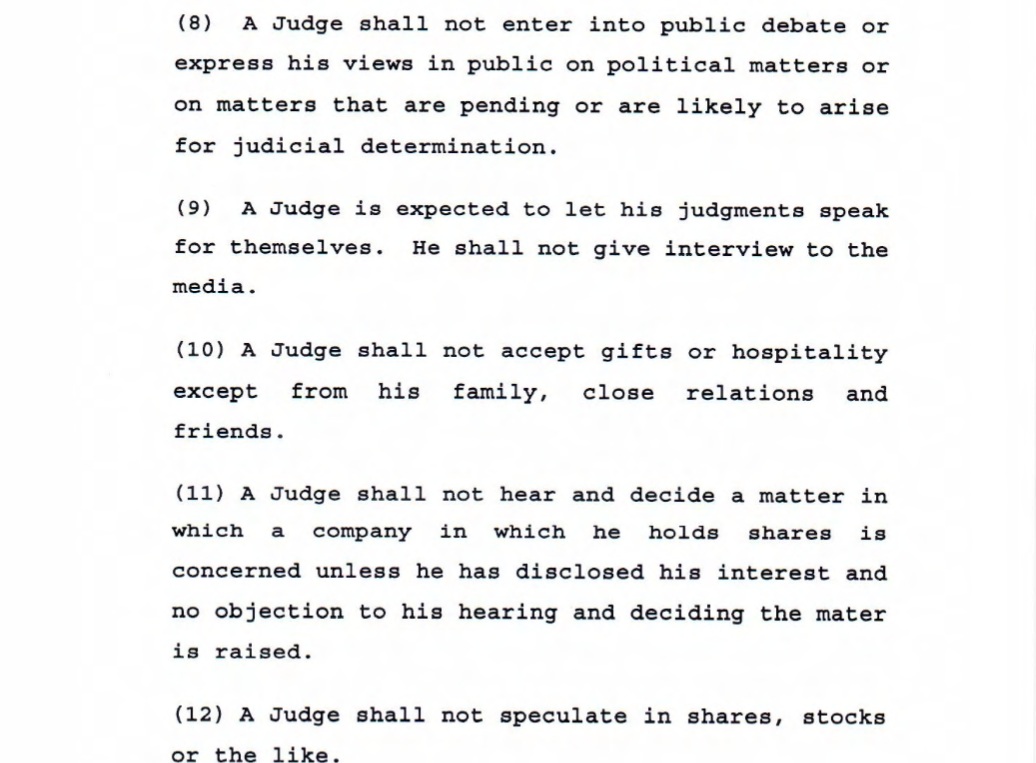 The 'Restatement of Values' document contains 16 values for judges to follow, including norms they "should" adhere to and acts they "should not" participate in from the point of view of propriety. These relate to their financial dealings, public appearances, who they socialise with, their political participation or commentary, and the norms by which they are to maintain a equidistance from cases they preside over. Some of the values relate to their personal connections and family relations.