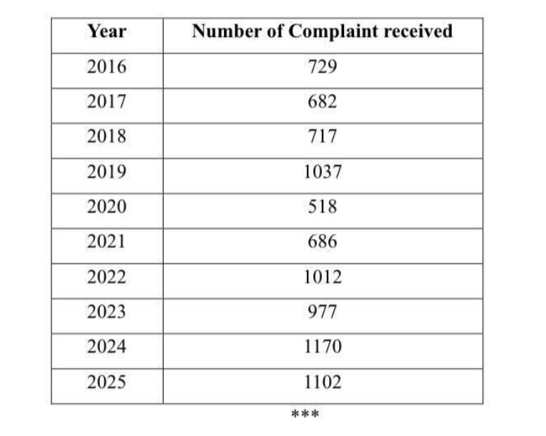 The response on February 13 only lists the number of complaints received by the Chief Justice of India from 2016 to 2025, with the highest number (1,170) in 2024 and the lowest (518) in 2020.