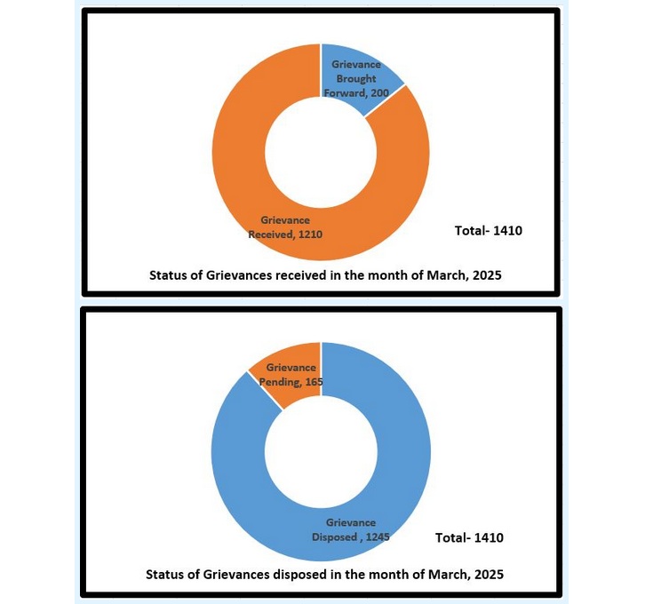 The web site says: "In the month of March 2025, 1410 grievance were received on CPGRAMS. A total of 1245 grievances were disposed leaving a cumulative pendency of 165." It does not elaborate the nature of complaints, or which levels of judiciary they relate to.
