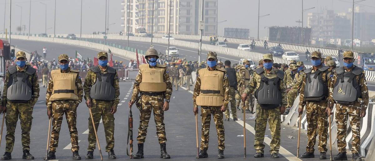 Delhi police at Delhi-Meerut Expressway amidst farmer protests, in New Delhi on December 7. Photo: PTI