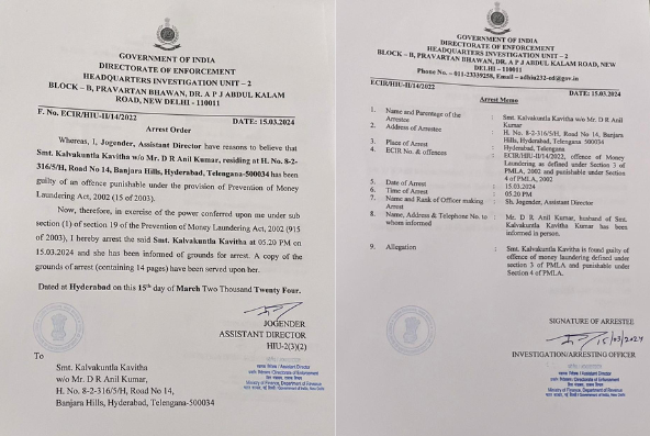 Hyderabad: Former chief minister K. Chandrashekar Rao's daughter and Bharat Rashtra Samithi (BRS) MLC K. Kavitha was arrested by the Enforcement Directorate following raids conducted by the ED and income tax officials at her residence in Banjara Hills on Friday, March 15.