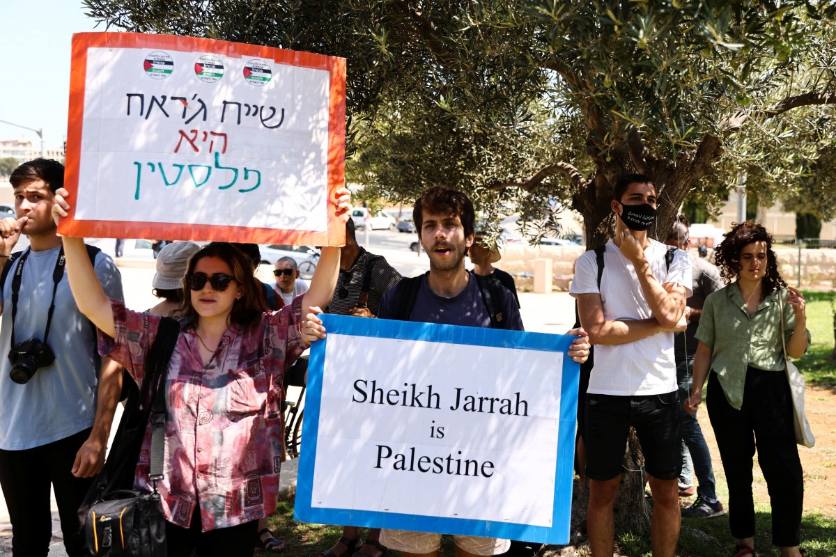 Protesters take part in a demonstration to show their support for Palestinian residents of Sheikh Jarrah neighbourhood facing eviction during a court hearing, outside the Israeli Supreme Court, in Jerusalem August 2, 2021. Photo: Reuters/Ronen Zvulun
