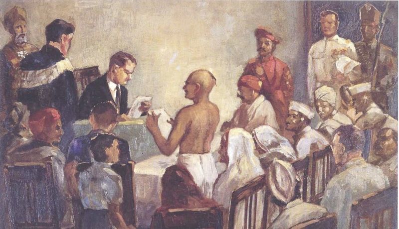 Ravishankar Raval's painting of Mohandas Karamchand Gandhi's 1922 sedition trial. Credit: Lalit Kala Akademi, Gujarat