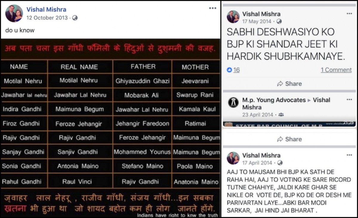 Justice Vishal Mishra's Facebook profile, which he has not updated since 2014, makes it clear that he has definite political leanings. In one post, the Nehru-Gandhi family are presented as Muslims and this is given as the reason the "Gandhi family hates Hindus".
