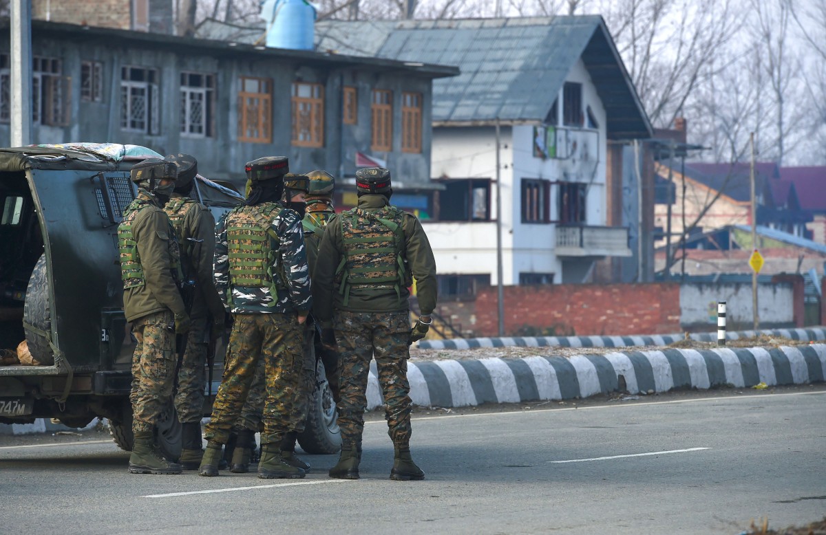 Military personnel stand near the site of the encounter at Lawaypora on the outskirts of Srinagar, Wednesday, Dec. 30, 2020. Photo: PTI/S. Irfan