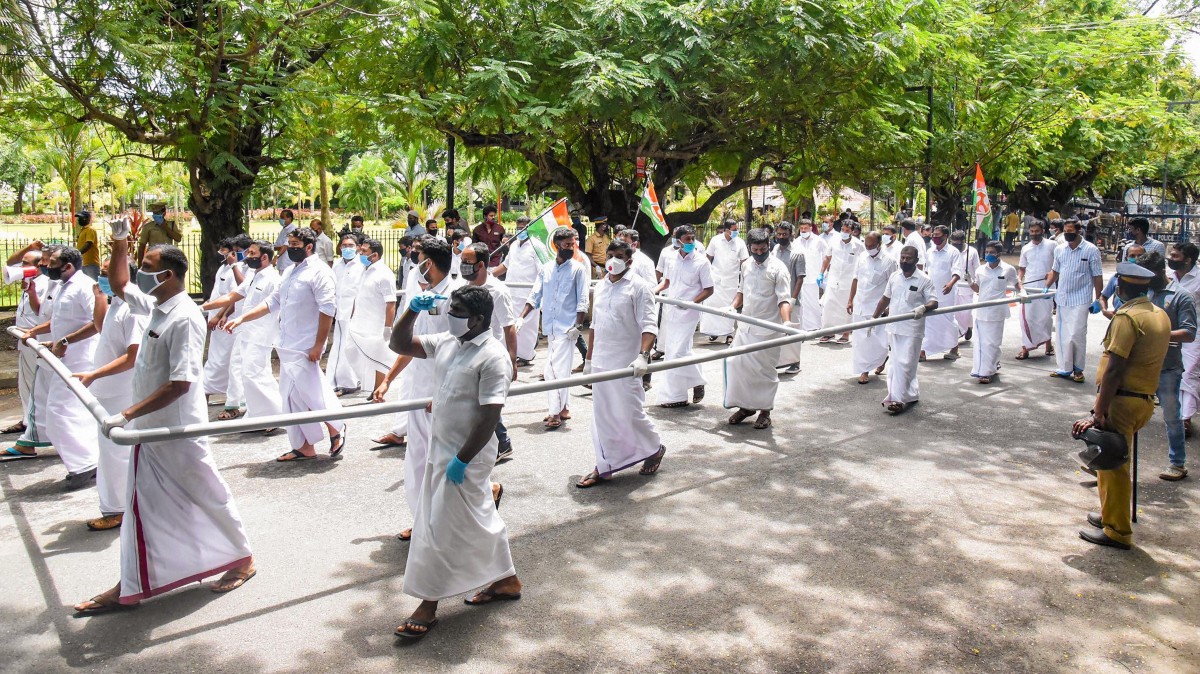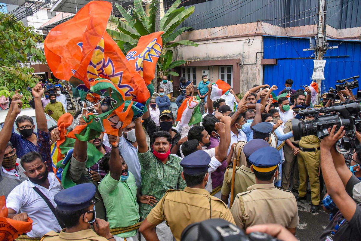 BJP workers during a protest against Swapna Suresh and Sandeep Nair, accused in Kerala gold smuggling case, in Kochi, Sunday, July 12, 2020. Photo: PTI