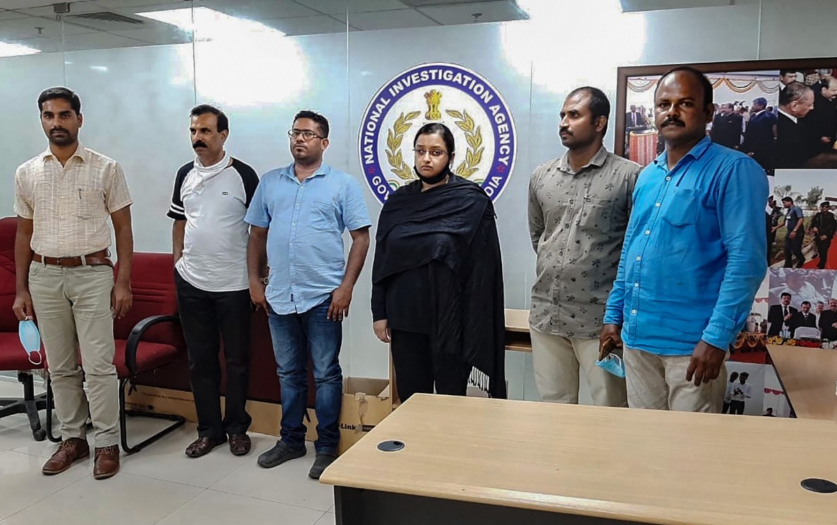 Kerala gold smuggling case accused Swapna Suresh and Sandeep Nair (both in middle) after they were arrested by the National Investigation Agency in Bengaluru, Karnataka, Saturday, July 11, 2020. Photo: PTI