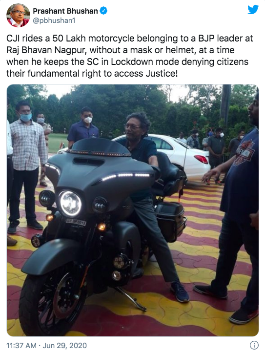 Speaking about Prashant Bhushan’s tweet regarding a photograph of Chief Justice S. A. Bobde sitting astride a Harley Davidson bike, Arun Shourie said: “Please don’t sit on mobikes costing 50 lakhs when you cannot afford it.” He seemed to suggest the Indian people could form an opinion of judges, the court and its propriety by such photographs.