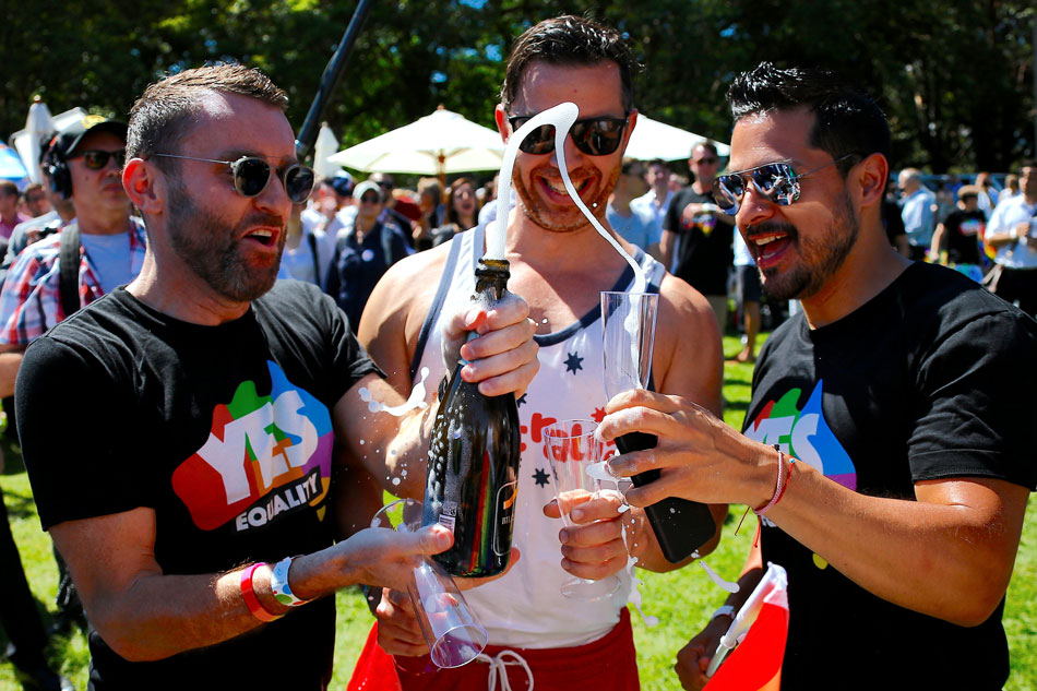 Supporters of the 'Yes' vote for marriage equality celebrate after same-sex marriage was accepted in a nationwide poll, at a rally in central Sydney, Australia, November 15, 2017. Credit: David Gray/ Reuters