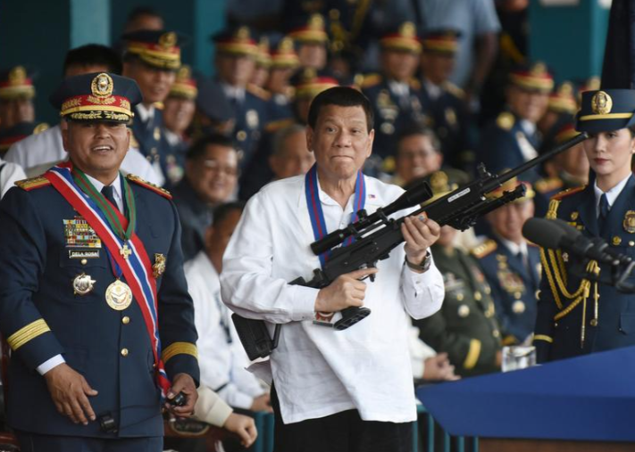 Philippine President Rodrigo Duterte holds a Galil sniper rifle next to outgoing Philippine National Police Chief Ronald Bato Dela Rosa during the National Police chief handover ceremony in Camp Crame, Quezon City, metro Manila, Philippines, April 19, 2018. Photo: Reuters/Dondi Tawatao