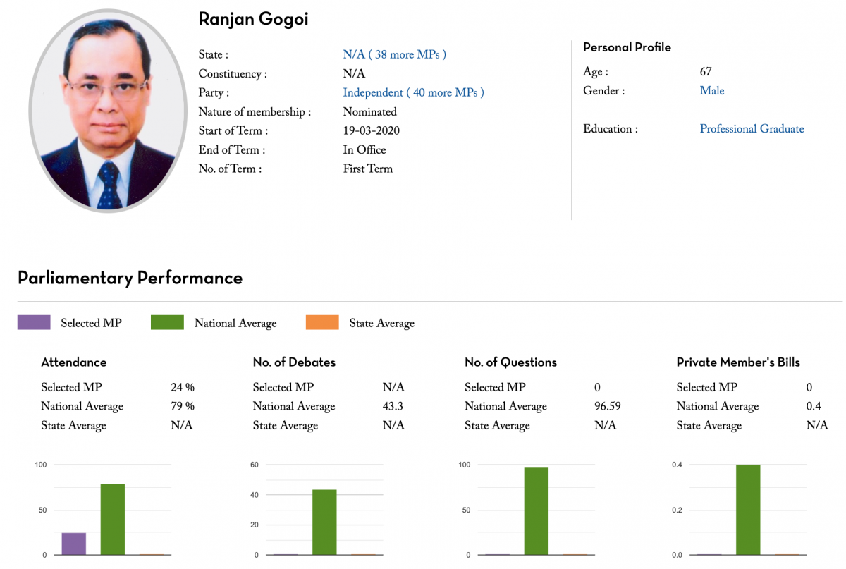 On the all important job of highlighting issues of public concern by asking questions of the government, Gogoi’s record in the Rajya Sabha is 'zero questions asked' so far. On an average, MPs who have spent the same time in the RS as Gogoi asked 96.59 questions.