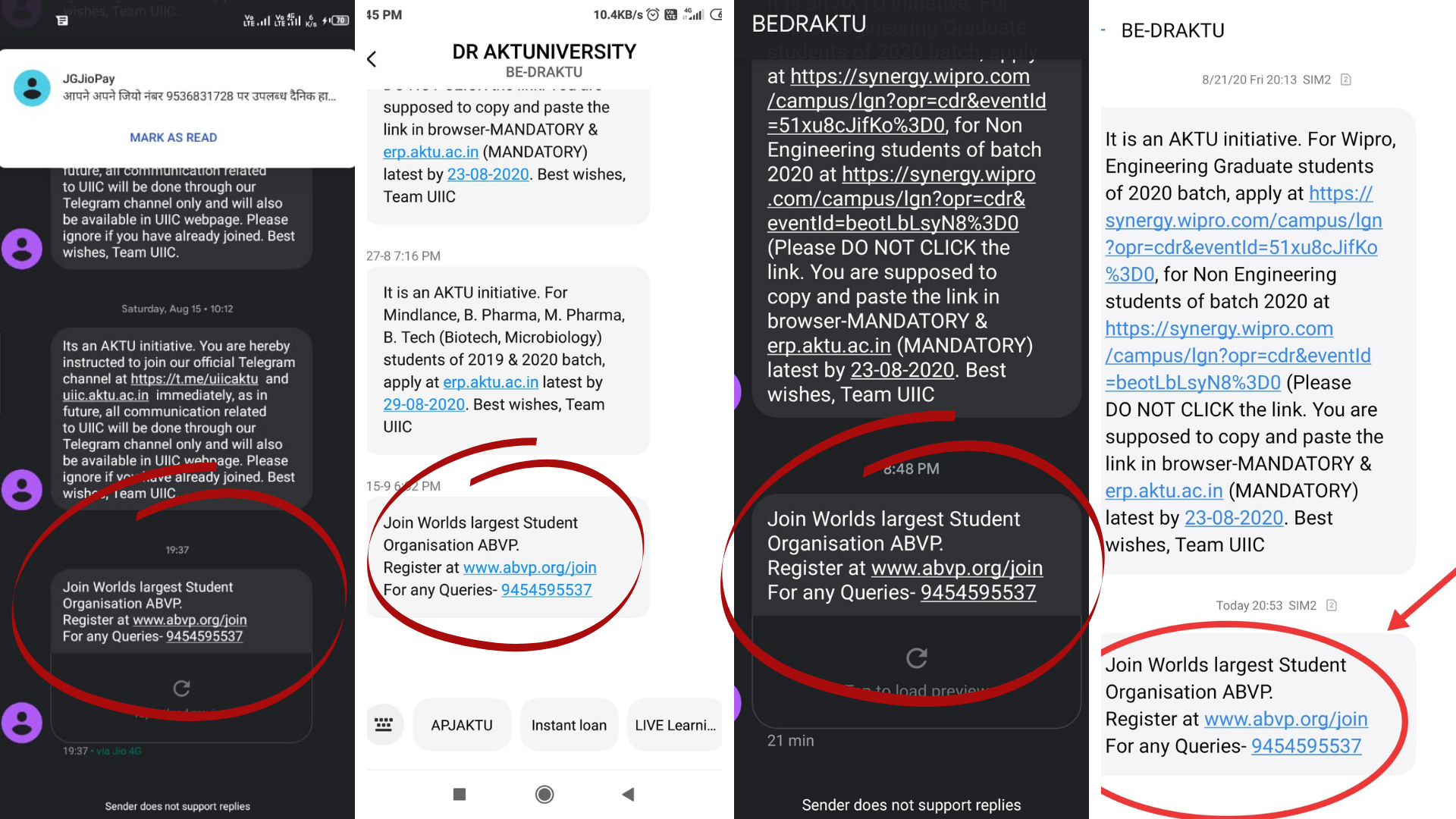 On September 15, students at Dr A.P.J. Abdul Kalam Technical University (AKTU), Lucknow, received an SMS from the college's official number, asking them to join the "world's largest student organisation ABVP".