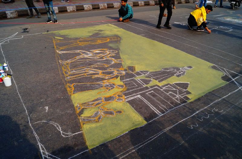 At the protest, which was led by students from the Fine Arts discipline, artists inscribed messages on the streets which rejected the triple threat of CAA, National Register of Citizens and the National Population Register.