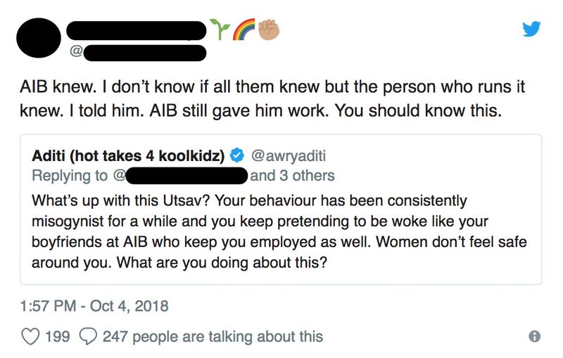 Aditi Mittal was one of the first to tweet at Chakraborty, calling his behaviour "consistently misogynistic" and also demanding a respond and action from his, as well as All India Bakchod, who have employed him in the past.