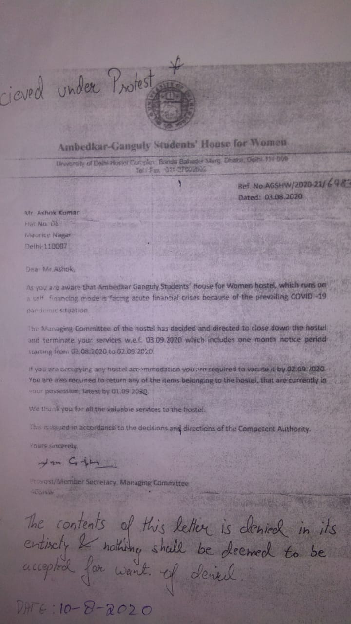 On August 3, 16 workers at Delhi University's Ambedkar Ganguly Students House for Women, received a notice which informed them that they had been fired. The workers who were let go were also asked to evacuate their university-allotted quarters by September 3.