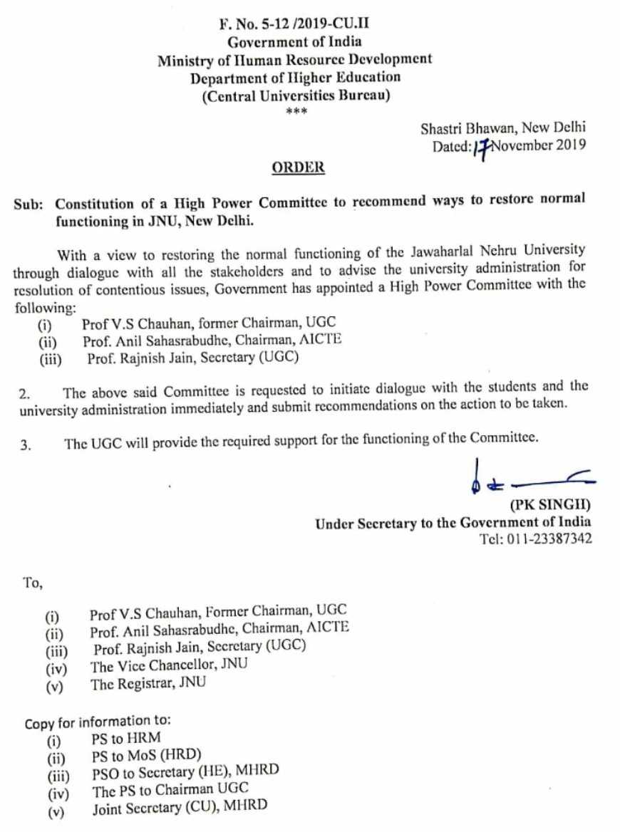 Meanwhile, the ministry of human resource development has issued a notice saying that the government has appointed a high-power committee to "restore normal functioning in JNU".