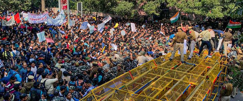 As soon as the students marched outside the university's entrance gate, the were met by police barricades and scores of policemen. Around the same time, Section 144 – which prohibits the assembly of more than four people – was also imposed in the area.