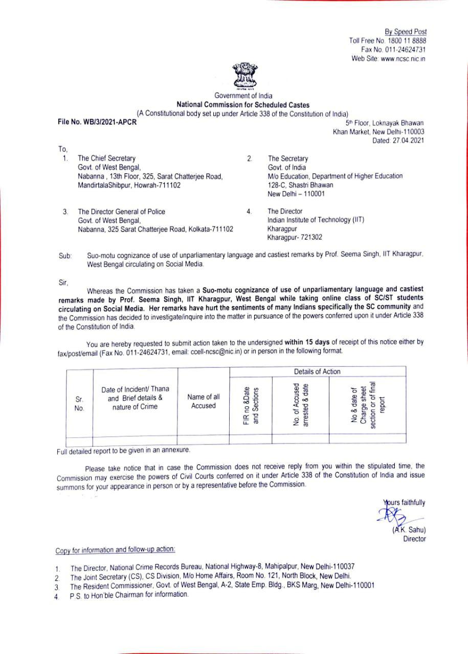 Secondly, the National Commission for Scheduled Castes have written an official letter to the chief secretary of West Bengal, the secretary of the department of higher education, the director general of police (West Bengal) and IIT Kharagpur's director stating the commission has decided to investigate the matter as Singh's remarks have "hurt the sentiments of many Indians specially the SC community".