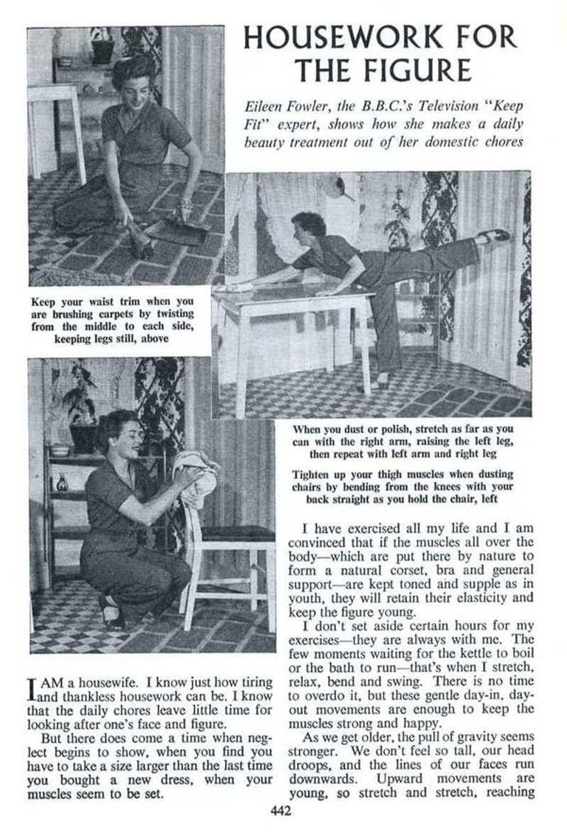 In this book from 1954, Eileen Fowler demonstrates how to clean and keep fit at the same time. Photo: George Newnes Publishing