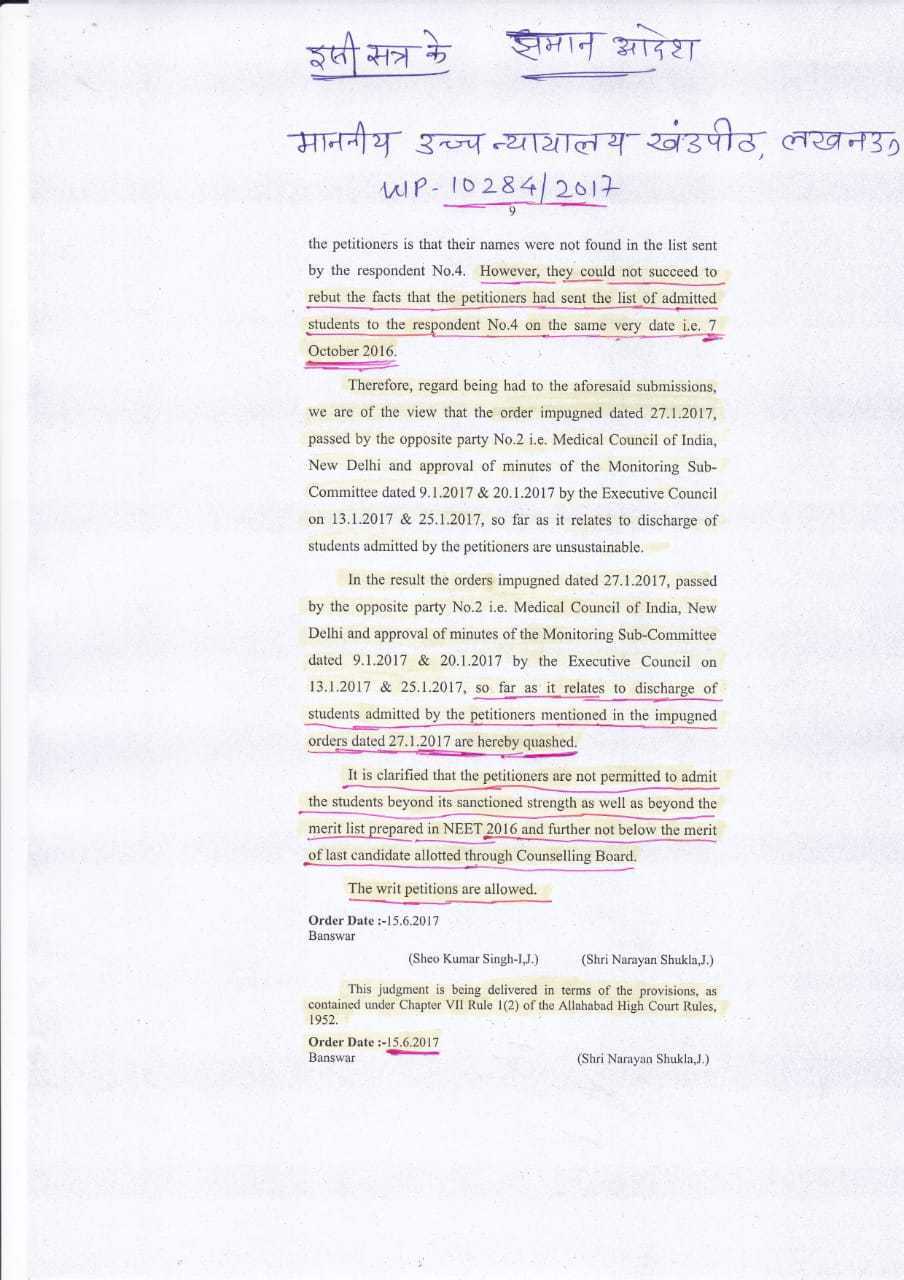 On July 15, 2017, the court quashed the discharge letter and gave the judgement in students' favour allowing them to continue their studies in their respective colleges.
