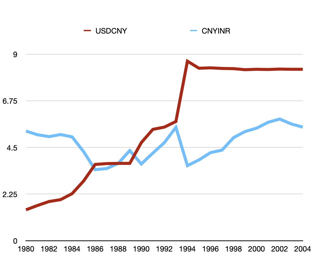 This plot shows that, while USD in Yuan climbed (or the Yuan depreciated against the Dollar) from 1.49 in 1980 to 8.27 in 2004, the value of the Yuan in INR remained in the range 5.29, to 5.48, the INR showing little depreciation again the Yuan.