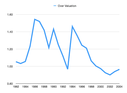 The over-valuation of the INR relative to the Yuan, both measured against the Dollar, went as high as 60% but generally stayed in the 30% - 40% range in the early 90s. This over-valuation caused asset prices in India to be as much as 15% - 30% higher than those of comparable assets in China.