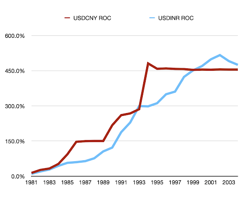 The duo initiated reforms, depreciated the INR by over 50% between 1991 and 1993, – a huge amount – but see the chart of USDINR and USDCNY ROC and you will notice that even this was peanuts compared to what the Chinese were doing.